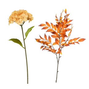 Lisää vielä muutama silkkikukka maljakkoon, esimerkiksi Ib Laursenin keltainen hortensia ja Nandinan oksa. Silkkikukkien värit ja muodot täydentävät toisiaan kauniisti.